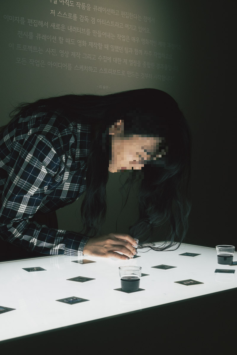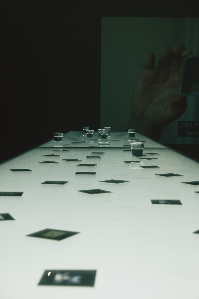 입장을 했다. 여러 사진들과 전시의 소개가 시작된다. 그리고 얼마 지나지 않아 이제껏 봐왔던 전시에서는 본 적이 없는 전시가 마련되어 있었다. LED전등이 들어오는 테이블 위에 작은 필름 들이 흩어져 있었고, 그 위에 함께 놓인 뷰잉렌즈를 필름 위에 놓고 들여다 보면 색다른 시각으로 사진을 감상할 수 있었다. 그냥 걸려있는 사진은 사실 어느 정도의 거리감이 있을 수밖에 없는데 이런 방식은 작품을 조금 더 가깝고, 자세하게 볼 수 있었다. 그리고 알게 모르게 입체감도 느낄 수 있어서 어릴 때 많이 봤던 매직아이(이거 알면 3040)처럼 다가와서 반갑기도 하고 작품도 평면작품을 입체적으로 볼 수 있음이 신기하기도 했다.